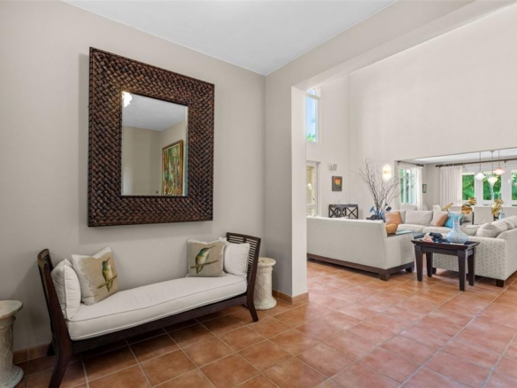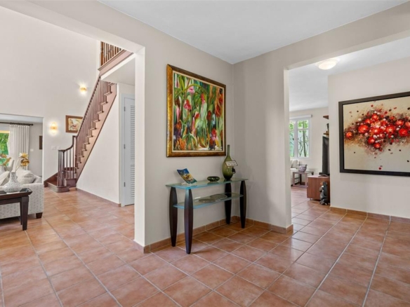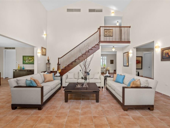 The home welcomes you with double-height ceilings and a spacious layout featuring a formal dining room, a comfortable family room, two terraces, and a three-car garage. The unique lot not only provides privacy and open garden views but also offers the opportunity to expand the property or design a spectacular pool and outdoor entertainment area.