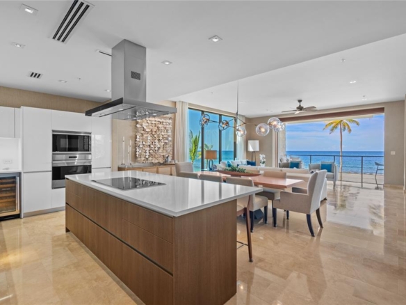 The custom-designed kitchen features top-tier appliances, bespoke cabinetry, and a generous island ideal for cooking, gathering, and entertaining. The primary suite serves as a private sanctuary with a soaking tub, outdoor rainfall shower, and walk-in closet. Two additional en-suite bedrooms provide comfort and privacy, each with peaceful garden or ocean views.