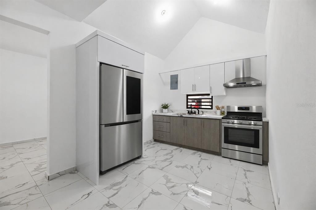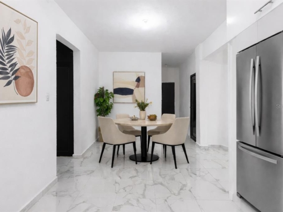 The kitchen and bathrooms feature custom cabinetry and vanities, accented by premium hardware and fixtures. Each bedroom includes new mirrored closet doors to maximize natural light. Outdoor features include a covered carport and a spacious, reinforced concrete terrace. The home is equipped with a new inline water heater and high-end finishes from floor to ceiling.