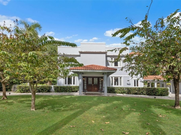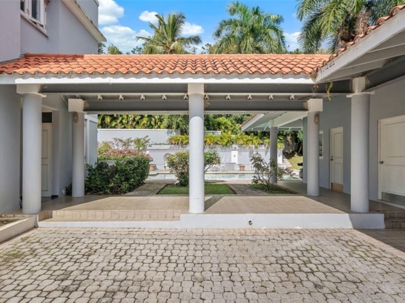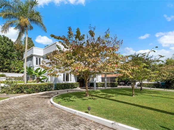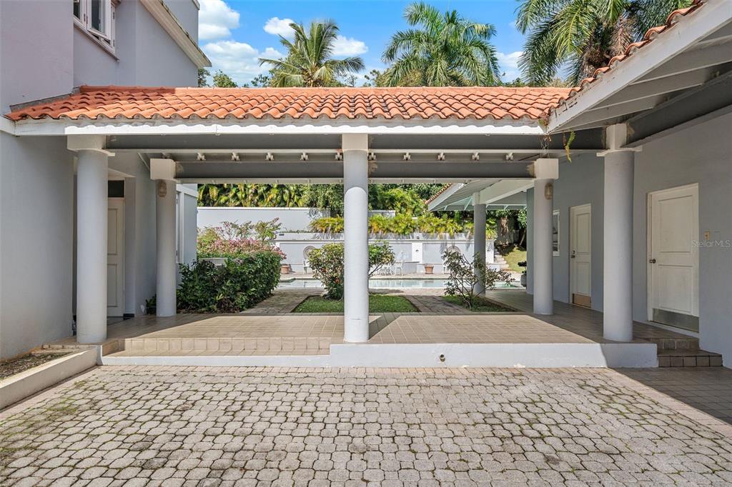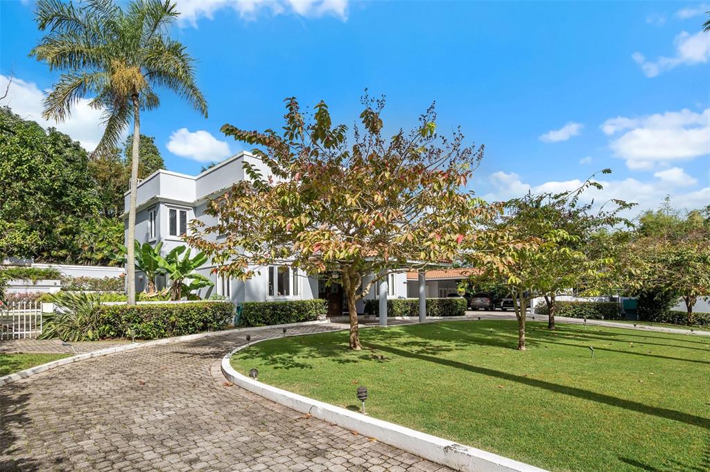 The arrival alone feels special. A long, gently curving driveway lined with manicured lawns and mature palm trees creates a sense of calm and anticipation. Behind the gates, a green esplanade leads you to a covered entrance and a solid wooden door framed by custom wrought iron, an elegant welcome home, every single day.