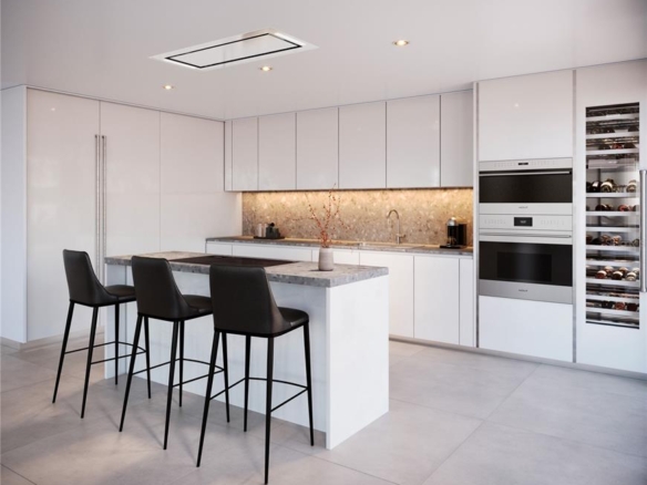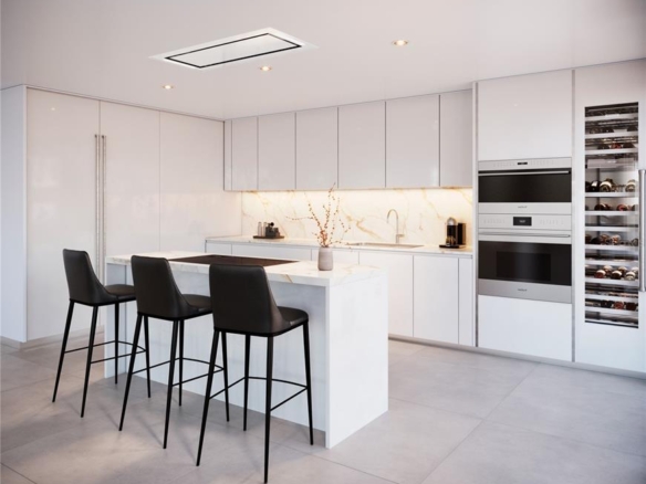 Refined interiors by Palacios enhance this gracious space, crafted with elegant finishes and modern details as well as integrated smart home features. The gourmet kitchen is custom-designed by Italian luxury brand, Boffi, featuring quartzite countertops, an oversized island, and is fully equipped with luxurious Sub-Zero and Wolf appliances that include a fully integrated refrigerator and freezer, five-burner cooktop, integrated dishwasher, wall oven, and wine refrigerator. For an added level of personalization, these kitchens are customizable, offering three different finish options to choose from.