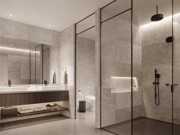 Residence 1101 is an expansive 4 bedroom, 4.5 bathroom corner residence offering 3,080 SF, and featuring a sundrenched 160 SF northwest facing terrace. With floor to ceiling glass windows, the sizable great room radiates with abundant natural light, showcasing sprawling views from every angle. The private primary suite offers a walk-in closet and a spacious en suite four-fixture primary bathroom with a double vanity and freestanding shower, outfitted with natural stone materials and textures, and complimented with Kohler fixtures and accents. The secondary bedroom offers west-facing views, en suite four-fixture bathroom, and generous closet space. A powder room and a utility closet with washer and dryer complete this masterfully crafted residence.