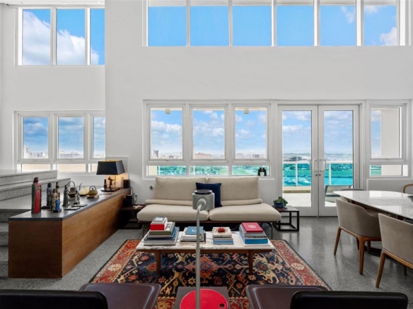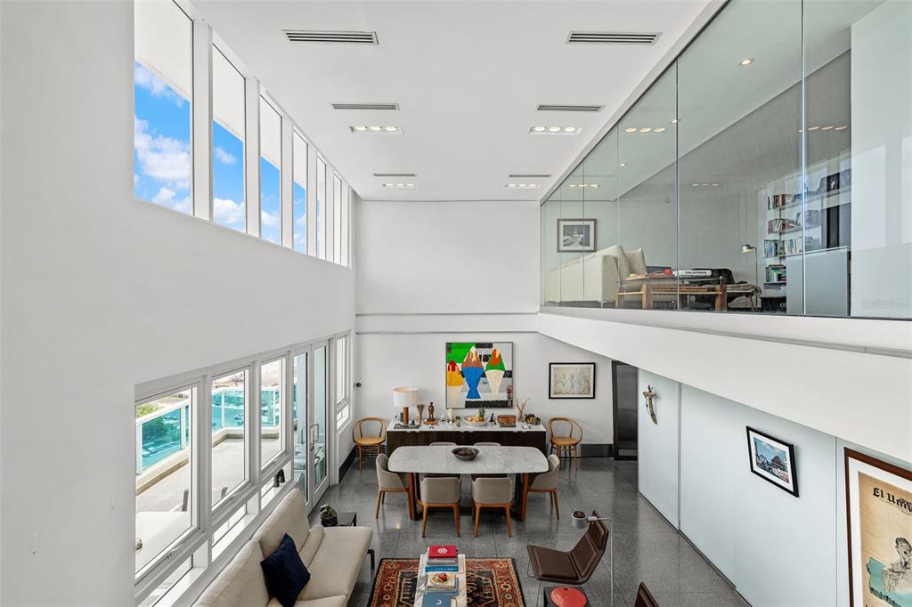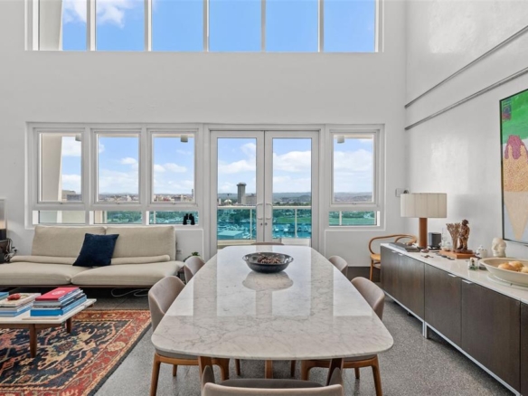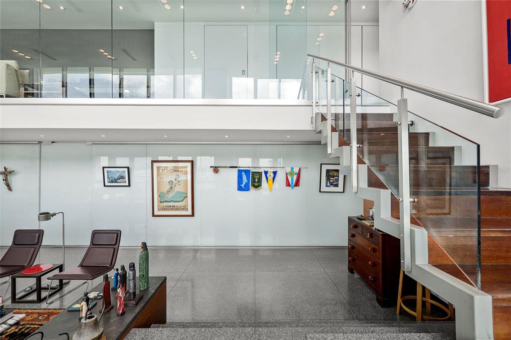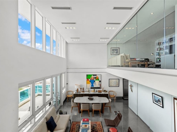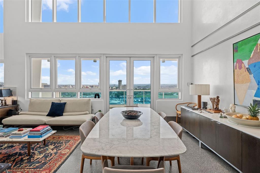 PH1608- MILLENIUM CONDOMINIUM - This unique custom designed penthouse residence showcases a modern contemporary architectural design, that offers a flawless balance of openness and natural light—designed for effortless relaxation and refined entertainment. From the moment you enter the expansive living area, panoramic 180-degree views of the Condado Lagoon and San Juan Bay unfold before you. Loft-style windows, soaring double-height ceilings, and a terrace stretching the full length of the room enhance the grandeur, while polished silver-grey terrazzo floors lend organic elegance and warmth to the modern design. A customized art-hanging system throughout the walls adds a unique gallery touch to the home.