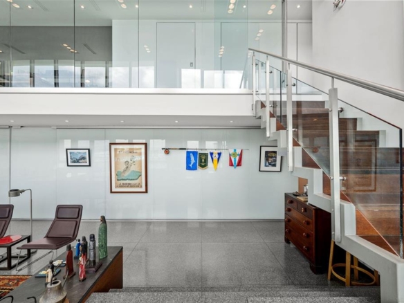 Upstairs, the second level embodies refined luxury. An open staircase of stainless steel and Brazilian wood, accented with a platform designed for art display, leads you to the master quarters. Here, breathtaking water views continue through a dramatic glass wall. The suite features a private library, walk-in closet, a serene bedroom, a spa-inspired bathroom, and its own terrace. The master level also includes one of the home’s two waterfront terraces, with a Japanese hot tub lined in soapstone—an intimate retreat reserved for the owner of this exceptional home.