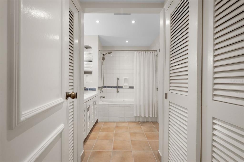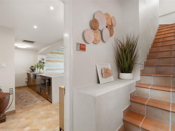A private vestibule welcomes you with two separate entrances, ensuring privacy and convenience for each space. The main level features a bright, open-concept living, dining, and kitchen area filled with natural light and framed by oversized doors showcasing lush tropical surroundings. The fully renovated kitchen is equipped with stainless steel appliances and a spacious island, ideal for both everyday living and entertaining. The primary bedroom comfortably accommodates a king-sized bed and overlooks the serene landscaped courtyard. A well-designed bathroom offers dual access from both the bedroom and main living area.