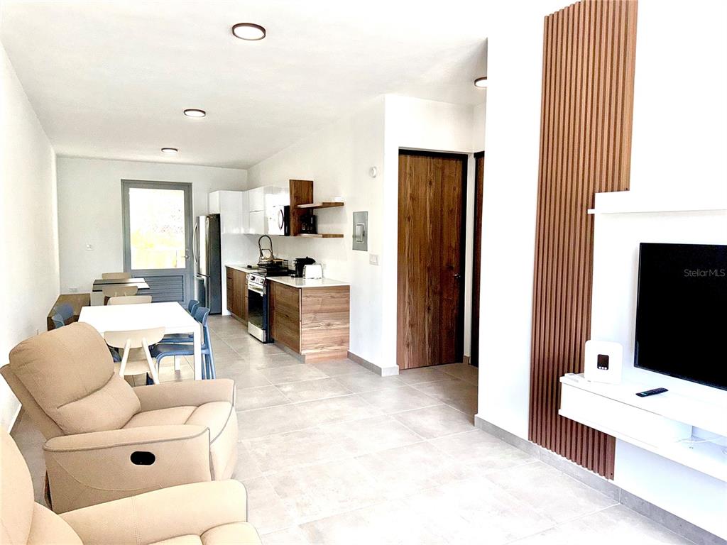New construction, conveniently located at approximately 300 lineal meters from town square and aproximately 400 lineal meters from the beach. Furnished, appliances (ac each room, washer, dryer, stove, refrigerator, electric water heater on demand, and microwave).