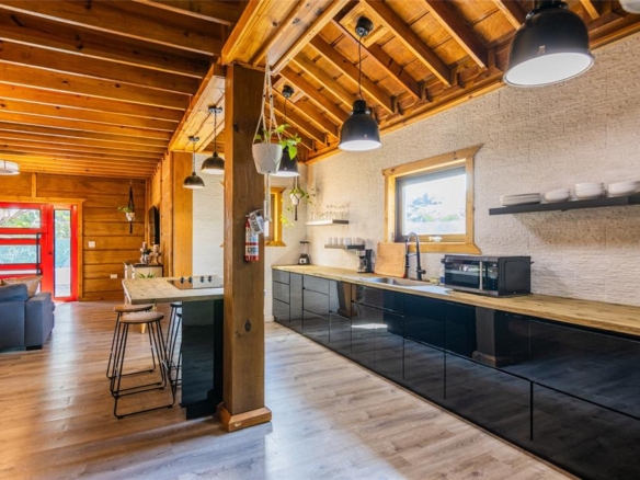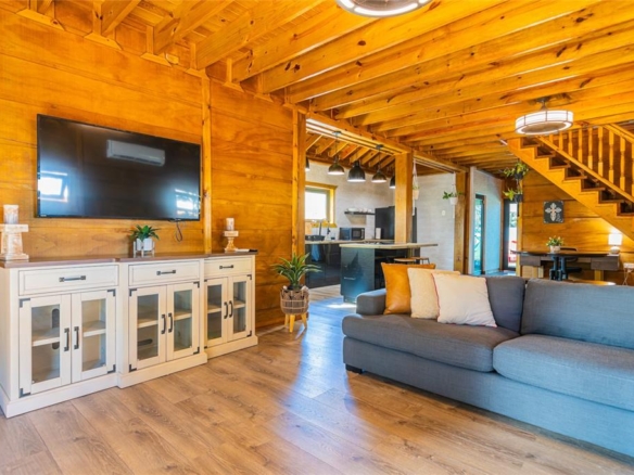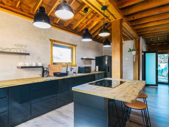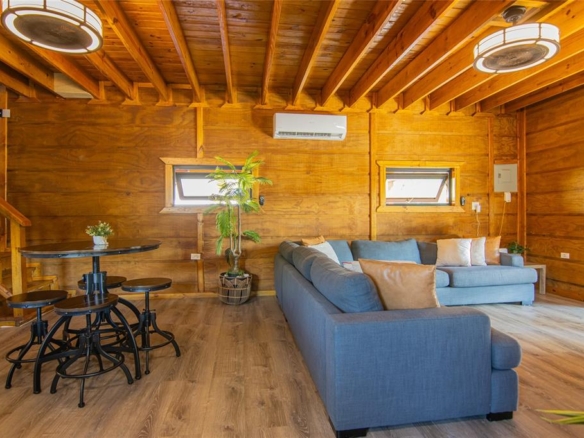 Contemporary cabin built less than 5 years ago with wood construction on a solid concrete base, located in Quebradillas in a high-demand area with quick access to beaches and neighboring Isabela. The property currently operates as a short-term rental (STR) with proven performance and excellent upkeep, yet it is also perfectly suited as a primary residence thanks to its spacious layout and distinctive design. The first level features an open-concept living area and kitchen centered around a large island. One bedroom is located on this floor.