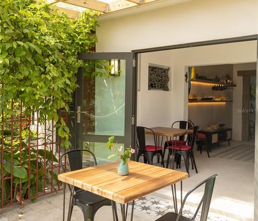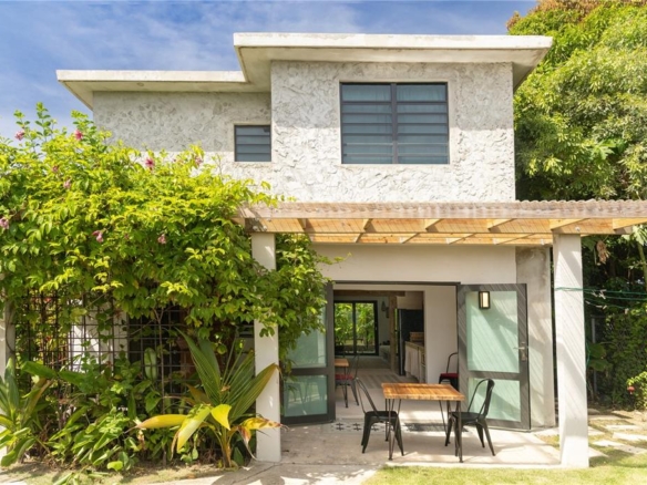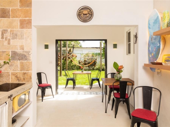 The home features an eclectic mix of design materials—polished cement, warm wood accents, and colorful decorative tiles—creating a vibrant, textured aesthetic that feels both tropical and timeless. The property consists of two separate apartments, offering flexibility for guests or multi-family living.