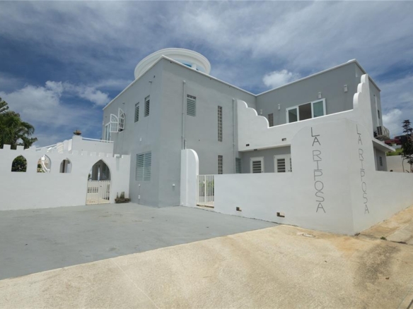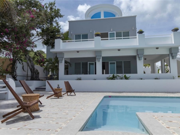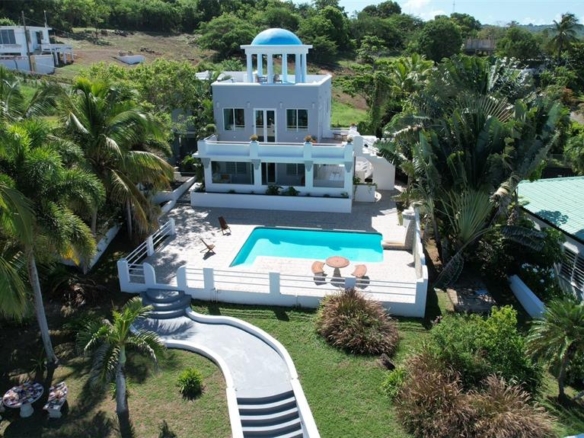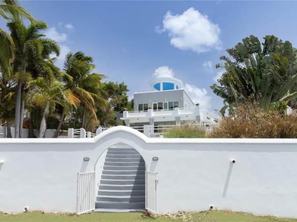The art deco style villa elegantly mixes Mediterranean and Caribbean architecture. It’s distinct blue dome has become iconic of the North Shore skyline. The most spectacular space is the upper level apartment which has a unique European vibe with its stone mosaic floors, cathedral-esque arches, and grecian style louvered cabinets. The back drop from the main living space and the large outdoor lounge are the magnificent pool and turquoise ocean. Some of the spaces best features are the exterior bathroom and the amazing rooftop duomo with views of the mainland, Palomino and Culebra. Its doric columns frame the spectacular sunrises and sunsets during the morning and evening hours and the ferries can be seen as they come and go during the days.