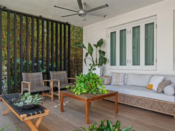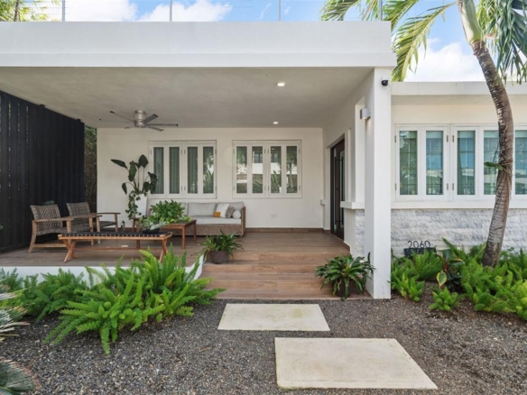 The interior flows seamlessly into over 1,000 square feet of covered and open terraces surrounded by lush landscaping designed by Sandy Balkow of OLA, creating a private tropical setting. Outdoor amenities include a sparkling saltwater swimming pool and a spacious rooftop terrace perfect for enjoying ocean breezes, sunset views, grilling, and entertaining.