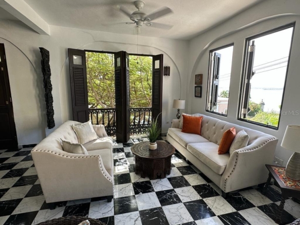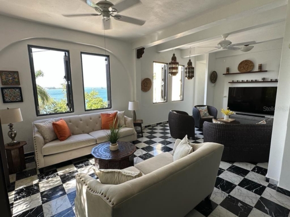 Elegant and upscale Penthouse apartment. Located in one of Old San Juan's premium locations. Steps from historic San Juan Cathedral and "Puerta de San Juan" (Door to San Juan), from times past when the Europeans arrived in the Old San Juan City. Beautiful street scenery and magnificent view of San Juan Bay. Enjoy breathtaking sunset views from the living room and roof deck. Close to San Juan's fine hotels, casinos, restaurants, beaches and tourist areas. Has four (4) bedrooms, two (2) baths, ceiling fans; air-conditioning units in each room, and in the dining room and family room area. Laundry room with a dual washer/dryer combo unit. Spacious kitchen with refrigerator, stove, oven, dishwasher and microwave. Living in the historic Old City is an exhilarating experience. Call for your appointment today.