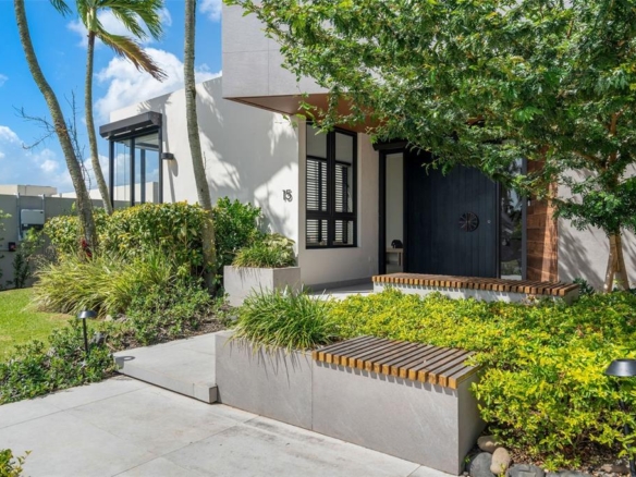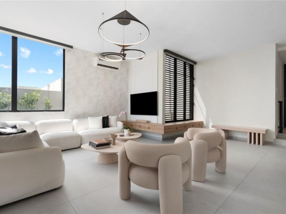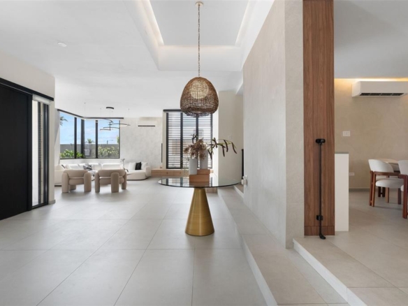 The kitchen stands out with Bertazzoni appliances and Quartzite Taj Mahal Leather countertops, complemented by a dry bar that adds to the home’s entertaining appeal. The outdoor space serves as a private retreat, featuring a terrace with a heated saltwater pool and jacuzzi, along with an outdoor kitchen and BBQ area.