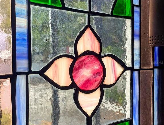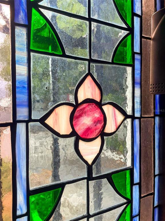 Large arched doors connect interior spaces to the garden and outdoor living areas. The backyard includes a covered terrace with a bar and barbecue area, creating an inviting setting for gatherings. A distinctive staircase with stained-glass windows leads to the upper level, where the primary bedroom suite features unique stained-glass elements that fill the room with natural light.
