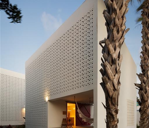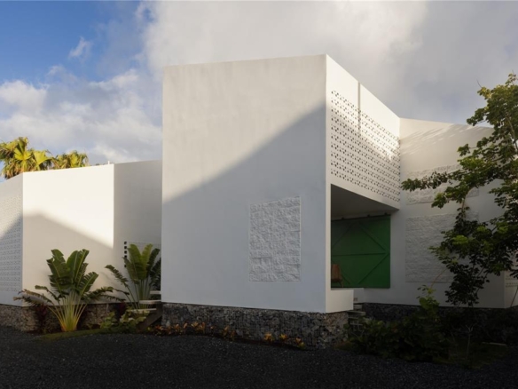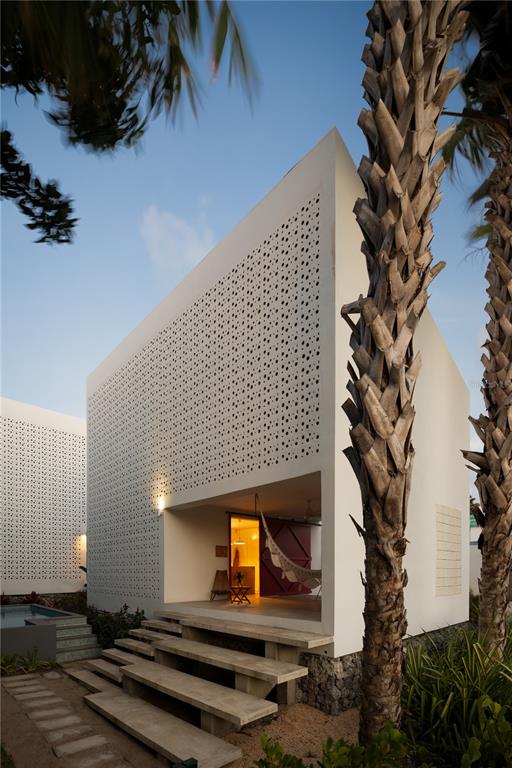 The two villas mirror each other in design, proportion, and spatial logic, reinforcing visual clarity while allowing flexibility of use. Their relationship is articulated through shared circulation, landscaped pathways, and outdoor spaces that create a cohesive yet adaptable living environment, balancing privacy with collective experience. Defined by pure volumes, white surfaces, and the prominent use of breeze blocks, the architecture establishes a strong visual identity while enabling permanent cross-ventilation and filtering daylight into shifting patterns. Light, shade, texture, and natural ventilation are integral to the design, generating a continuous connection between interior and exterior spaces through open corridors, intermediate patios, generous balconies, and double-height areas.