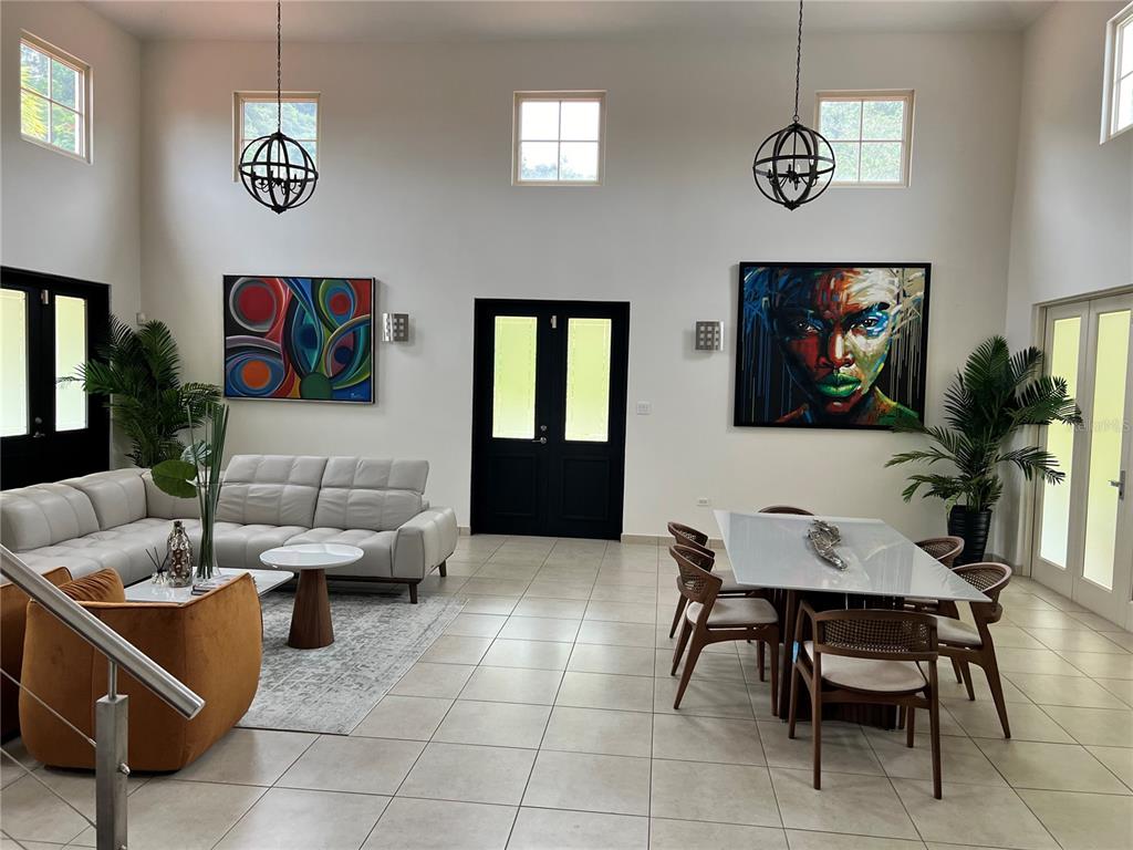Dramatic open-concept layout with soaring cathedral ceilings and floor-to-ceiling glass windows that bathe every room in natural light. Expansive living and dining areas designed for both comfort and entertaining. Stunning mezzanine/loft family room overlooking the living area, adding a stylish architectural touch. Fully furnished with brand new living room, dining room, and kitchen furniture — move-in ready from day one.