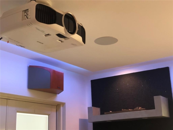 Fully equipped gourmet kitchen featuring premium stainless steel appliances: refrigerator, freezer, stovetop, hood, dishwasher, microwave, and wine cooler. Adjacent state-of-the-art home theater with a projector, 110” screen, and a premium surround sound audio system — perfect for movie nights or entertaining guests.