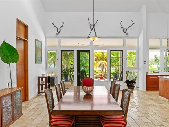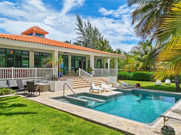 The property is also available for sale at $2,500,000. Enjoy beachfront living at its finest with this private coastal retreat in Rio Grande, situated within a quiet cul-de-sac. Affording approx. 1,880 interior Sq. Ft. and approx. 2,997 exterior Sq. Ft., the expansive residence sits on over a quarter of an acre of fenced and manicured land. Boasting unparalleled privacy, the home also showcases an inviting contemporary design with travertine flooring and unique features, such as vaulted ceilings with up to 18’3’’ heights and a skylight in the open-concept living/dining area that leads to the fully-equipped galley kitchen with center island. Both bedrooms are ensuite and lead out to the oversized covered/uncovered wrap-around patio accented by an oceanview saltwater pool with lighting measuring approx. 24 x 12 and a separate half bath. The primary suite generously includes a walk-in closet with custom made built-in cabinets and attic space. A dedicated laundry room, storage area, enclosed driveway with space for 6 cars and a generator complete this exceptional offering. The residence is perfectly positioned near the Wyndham Rio Mar Resort, an exclusive beachfront community with an array of desirable amenities, such as renowned restaurants, pools, casino and spa, in addition to fourteen tennis courts and two 18-hole championship golf courses. Rio Grande is positioned on the island's scenic eastern coast, home to multiple highly-acclaimed resorts and the El Yunque Rainforest, one of the Puerto Rico's most precious landmarks and an ecological marvel. The region is also a 45-minute drive away from the largest marina in the Caribbean and the vibrant metropolitan epicenter of San Juan. Embrace a serene lifestyle by the beach while still being within close proximity to the amenities of the city.
