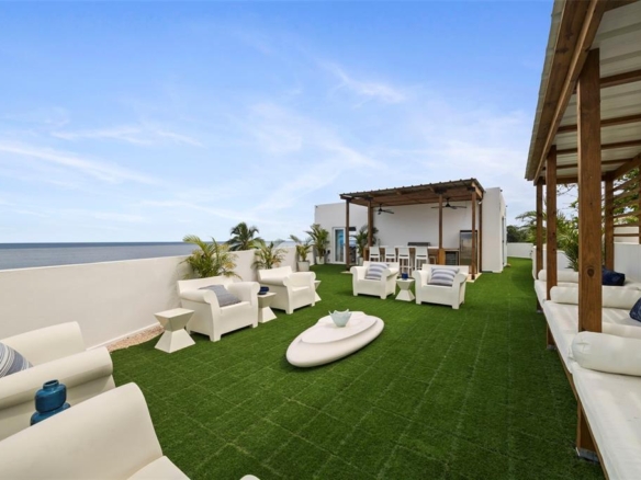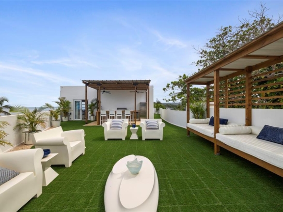Imagine stepping onto the rooftop terrace of your dreams! A private sanctuary suspended above the beach, where design, nature and indulgence meet. Welcome to the penthouse at the Eco Resort in Barrio Carrizales, Aguada. This 2 story, 4 bed, 3 bath apartment is the only unit in the complex with access to the 2,000+ sf rooftop that has been professionally decorated & renovated. This outdoor haven is an entertainer's dream; including a covered outdoor kitchen with dining table, a lounge area perfect for soirées under the stars or a movie night on the big screen projector. During the day you will enjoy ocean views of the beaches of Rincon, Aguada and Aguadilla. Walking into the penthouse you'll be greeted by the newly renovated kitchen that opens up to the living room allowing ocean views from almost every angle. Stepping onto the balcony from the living room you're greeted by an awe-inspiring vista of the beach and reef below. A perfect spot to curl up with a morning coffee or unwind with a cocktail by the shimmering night lights. Upstairs you'll find 3 beautifully decorated bedrooms, 2 bathrooms and another living room that can easily be converted to another sleeping area. The total interior square footage is 1,433 with ceiling fans and inverter split ACs in almost every room. This penthouse is completely turnkey and includes all furniture and appliances, plus an oversized reserved parking space big enough for 2 compact cars within the gated parking lot. The HOA is only $240/month and taxes are approximately $3,160/year.