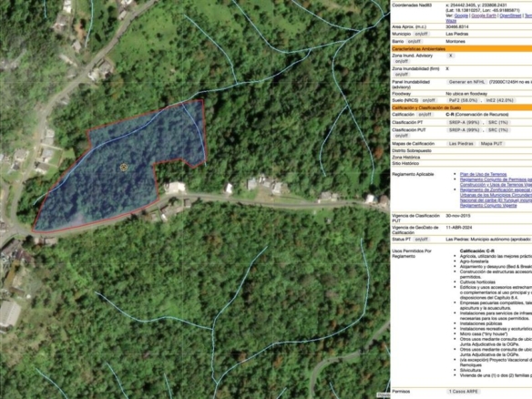 Excellent investment opportunity in Las Piedras, located on Carr. 917, Bo. Montones. This expansive lot comprises approximately 30,466 square meters (7.53 acres / 7.75 cuerdas), classified under C-R (Conservation of Resources). The zoning allows for multiple permitted uses including eco-tourism projects, agricultural development, glamping, cabins, tiny homes, bed & breakfast establishments, or residential housing, among others. The property is ideal for the cultivation of agricultural products in Puerto Rico, offering an exceptional natural environment and spectacular panoramic views. This is a unique opportunity for sustainable investment, eco-friendly development, or a serene retreat surrounded by nature. Owner financing available.