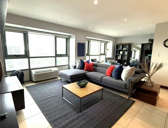 The apartment features an open layout with 1 spacious bedroom, 2 full bathrooms, and 1 parking space. Enjoy modern finishes throughout, a fully equipped kitchen with all appliances, elegant drop ceilings with recessed lighting, and abundant natural light.