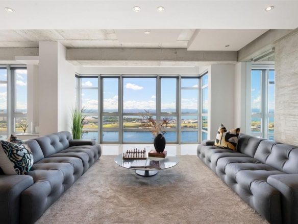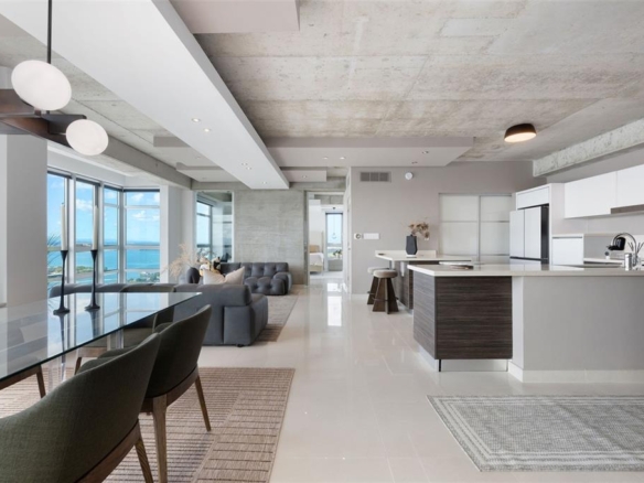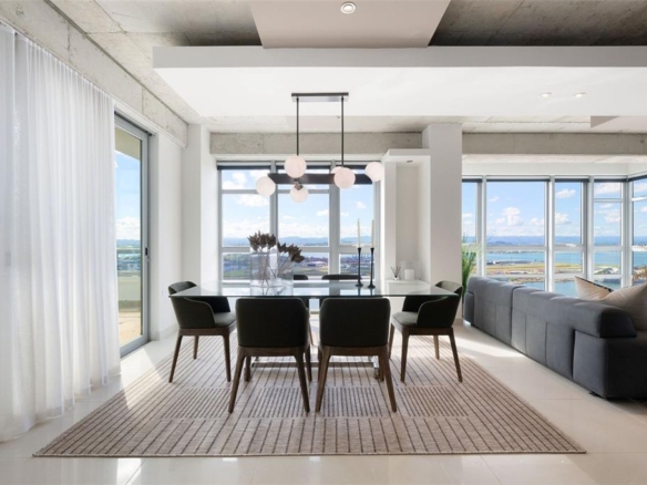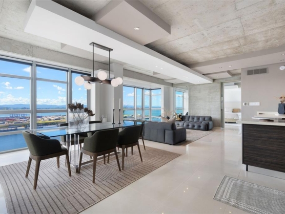 This spectacular sub-penthouse 23rd floor residence at Atlantis Condominium features floor-to-ceiling windows and exposed concrete, creating a bright open-plan living space with breathtaking views of the San Juan Bay, Old San Juan, and surrounding mountains and the ocean.