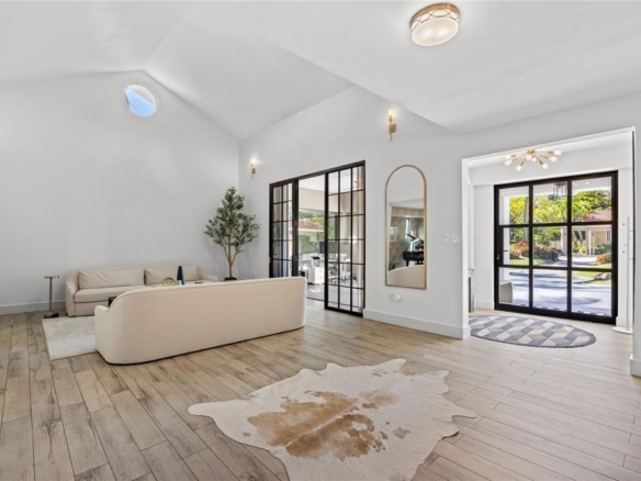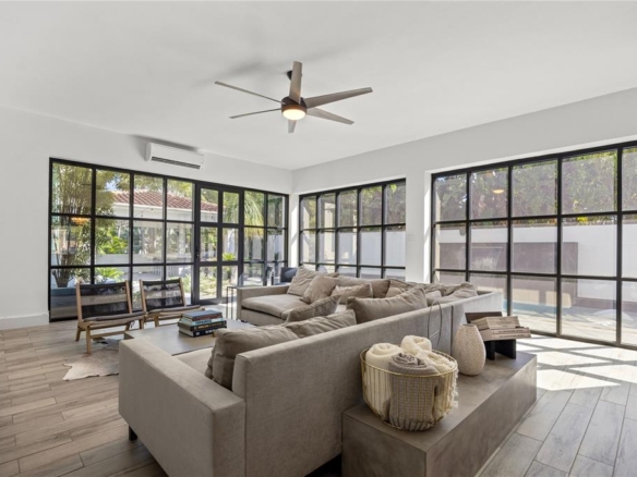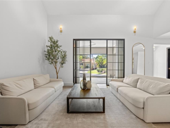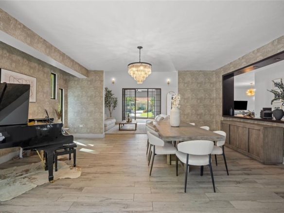 Among the many standout spaces, the great room may be the most striking, with expansive new windows that frame the pool and outdoor living area, bringing the views and light indoors.