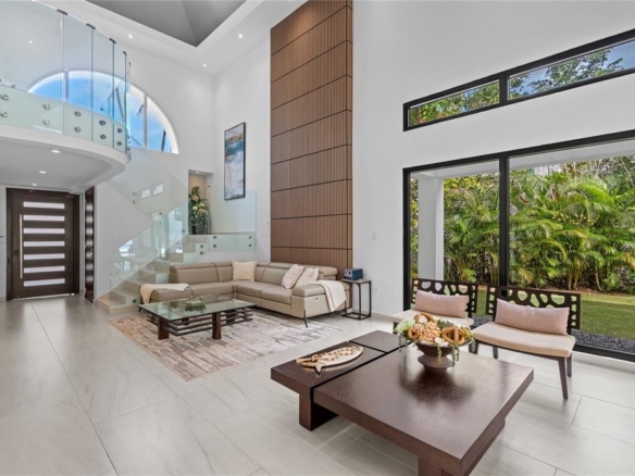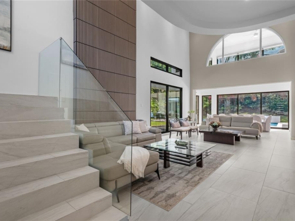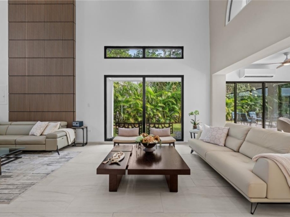 New glass windows and sliding doors enhance natural light and complement the home’s modern feel. The kitchen offers an open layout that connects to the dining area and terrace, providing views of the outdoor space. The outdoor area is a standout, offering a modern pool surrounded by lush landscaping, along with an outdoor kitchen, gazebo, and spacious terrace perfect for entertaining.