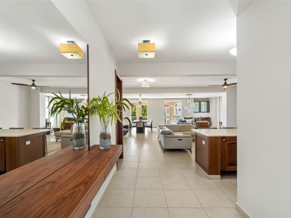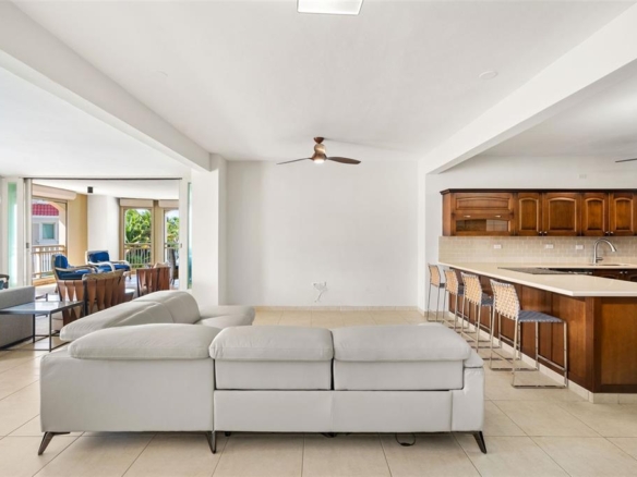 Located directly on the shoreline within Palmas del Mar, this four-bedroom residence captures uninterrupted ocean views and the natural light that defines Caribbean living. The open-concept design seamlessly connects the living, dining, and kitchen areas, creating a spacious central gathering area that extends toward an oversized balcony overlooking the water. Large openings invite in steady coastal breezes and frame the ever-changing blues of the sea, establishing a strong indoor-outdoor connection throughout the main living spaces.