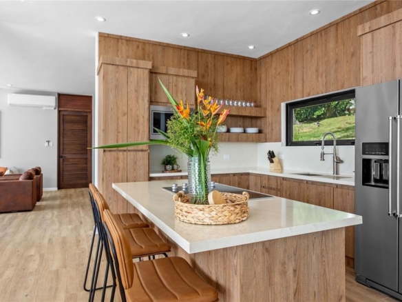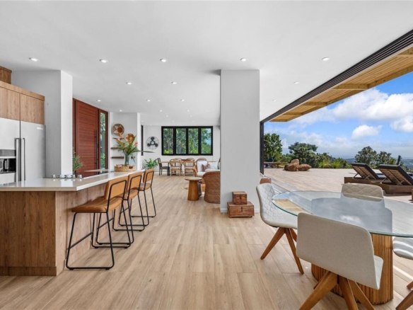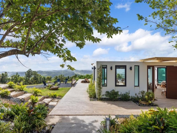 Casa Indigo is a stunning mountain retreat located just 40 minutes from San Juan, featuring a main house and two beautifully designed villas, all constructed with concrete for exceptional durability. The main house boasts 10-foot high ceilings and an open layout that includes a modern kitchen, two dining areas, a formal living room, and a powder room. The spacious family room, complete with a bar area, TV, and game table, is perfect for gatherings and entertainment, all overlooking a large terrace equipped with an infinity pool and hot tub, as well as inviting outdoor seating areas. The master bedroom in the main house features ample closet space and an outdoor shower surrounded by lush trees and vibrant plants, creating a tranquil escape. Each independent villa is thoughtfully designed with a king-size bed and trundle beds, making them ideal for families or groups. Each villa also includes its own kitchenette, closet, and outdoor bathroom for added privacy. The outdoor layout enhances relaxation and luxury, with the infinity pool offering stunning views and a calming ambiance. The expansive terrace provides ample space for lounging and dining, while the lush landscaping fosters a natural sense of privacy. Unique outdoor showers and a pickleball court add to the fun and activity options. Enjoy breathtaking sunsets and stargazing at night, making Casa Indigo the perfect blend of relaxation and luxury in a stunning setting!