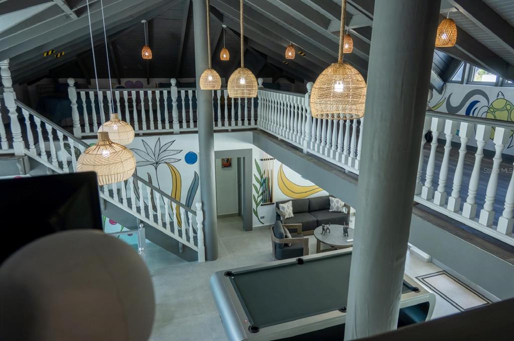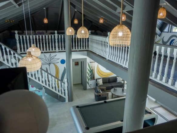 area, family room, open mezzanine with 10 beds, and modern billiard table (approx. 20-