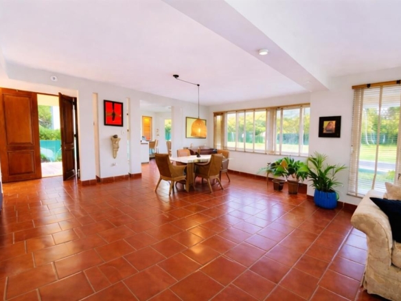 The home features a bright open-concept layout with high ceilings and classic terracotta