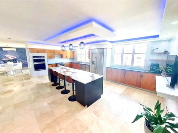 • Chef’s dream kitchen with double ovens, Galley workstation sink, Gourmet coffee maker, ice maker, and 4’ x 12’ marble island