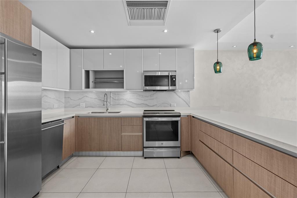 Gourmet kitchen with white-marble backsplash and frost-white quartz countertop