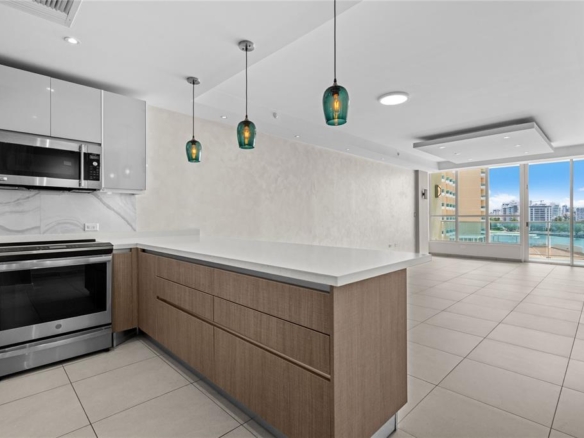 Bright open-concept kitchen and living area framed by lagoon views