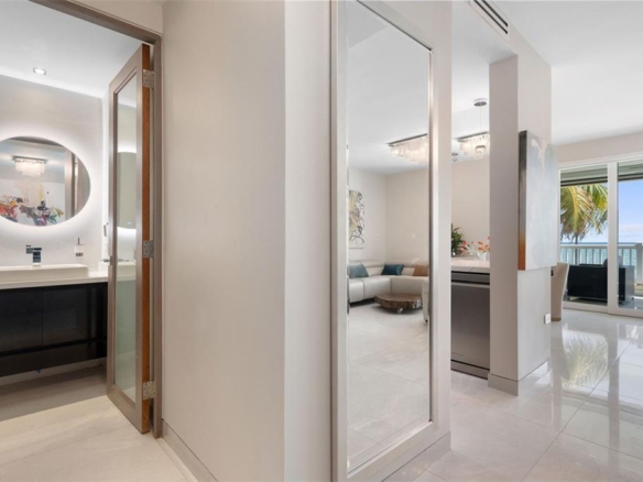 The balcony features a European motorized screen for insect protection and sun control. The living room door system has been raised for better water runoff and includes a new motorized hurricane shutter with reinforced removable components. Motorized shades in the living room, primary bedroom, and bath allow for privacy without losing the view.