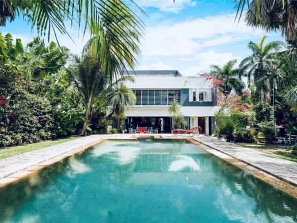 Welcome to this stunning architectural jewel in Garden Hills, a unique masterpiece designed by a renowned architect showcasing a harmonious blend of urban elegance and modern functionality, offering an unparalleled retreat just moments from the city and a few steps to the Caparra Country Club. The home sits on almost half an acre, one of the largest lots in Garden Hills. Situated in a very private dead end street, in a gated community, the residence is in Garden Hills, one of THE most exclusive coveted neighborhoods in Guaynabo and the San Juan metro area. This thoughtfully designed home features an open-concept floor plan perfectly integrating the ample dining area to the majestic Great Room with its soaring double height cathedral ceilings, all seamlessly flowing to the 3 terraces surrounding it in every corner. The perfect flow between the indoor and outdoor living areas connects all three terraces to the 2 tranquil koi ponds and the striking infinity pool in the center, providing a peaceful and serene oasis, yet also ideal for hosting and entertaining large gatherings. The home also boasts 3 bedrooms all with en-suite baths and a fourth flex room , or caretaker’s bedroom with bath, a family room, a powder room and an office with a separate entrance overlooking the scenic gardens. The master bedroom has its own private terrace with an outdoor pool/spa also overlooking the lush gardens. The chef’s kitchen combines sleek finishes with functionality and opens to another terrace and small pond, making it ideal for intimate gatherings. The office features custom built-ins and faces another terrace with an oriental style pond filled with water lilies, adding a unique peaceful and inspiring work area to the room. All is complemented with more luxurious details such as abundant natural light, fresco paintings, a 1000 bottle wine cellar, stone floors, an elevator, stained glass windows, 2 car garage, a generator and a cistern.