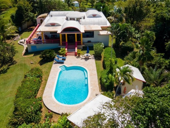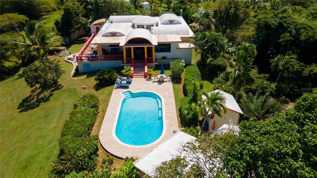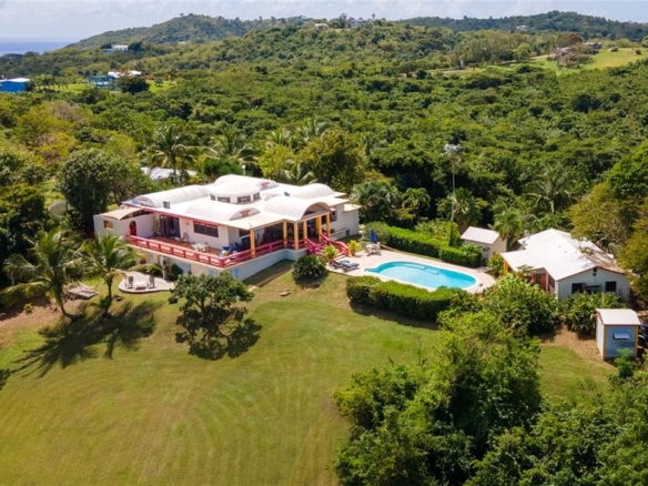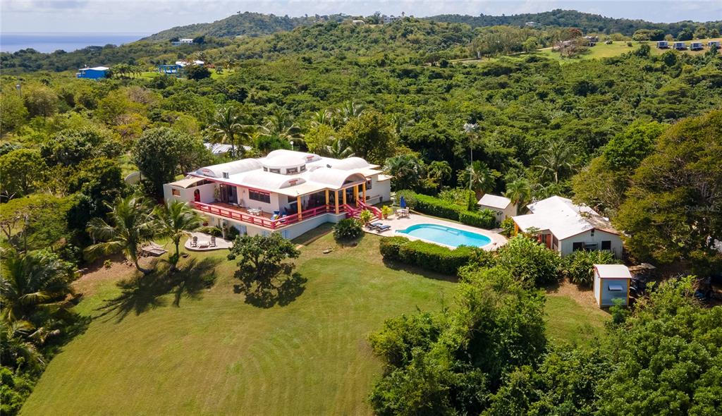 Quiet Pilón property on 2.63 cuerdas with 5 bedrooms and 4 bathrooms across three living spaces. The main house has 2 bedrooms, 2 baths, a chef’s kitchen, dining area, and decks with water views. A swimming pool separates a 2-bedroom casita with kitchen and bath from the main house, and a 1-bedroom apartment with private access adds extra space. Set among fruit trees and tropical gardens, the property has plenty of room to expand and is just 10 minutes from some of the best spots that Vieques has: Sun Bay, Playa Negra, and Esperanza.