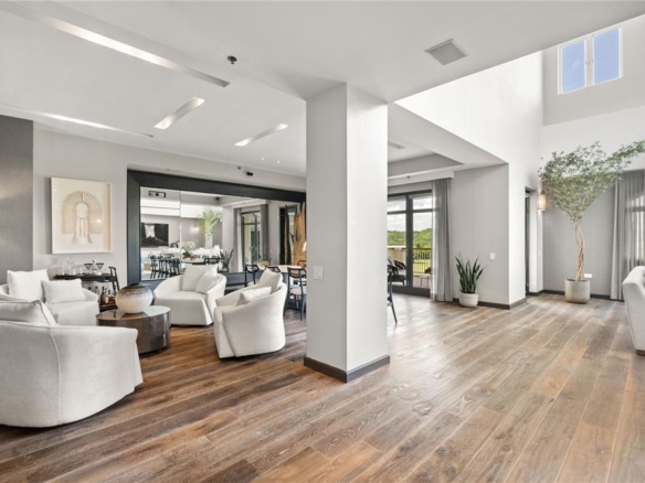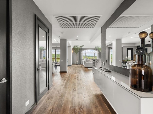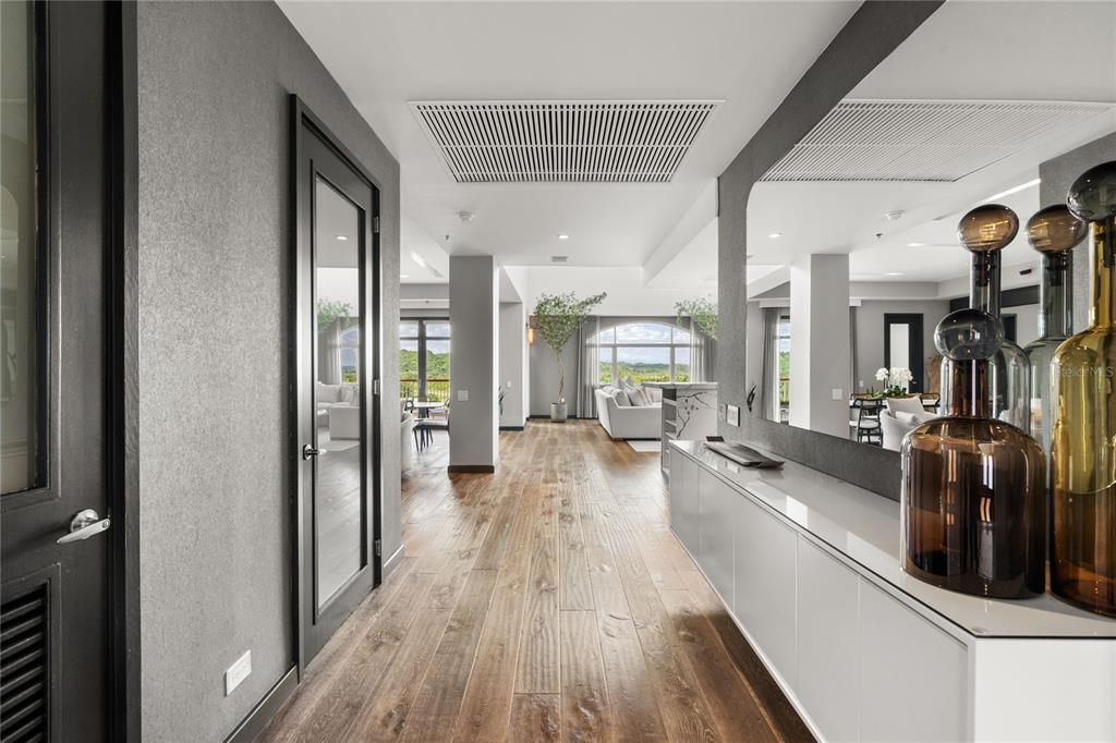 Upon entering the living spaces, be captivated by the grandeur of double-height ceilings in the expansive living room creating an atmosphere of elegance and spaciousness. The open floor plan harmoniously blends the living, dining, and kitchen spaces, which are adorned with state-of-the-art Sub-Zero appliances. Designed by renowned local interior designer, Caro Benezar, the interiors epitomize modern luxury and timeless allure. The penthouse features three en-suite bedrooms, each a tranquil retreat, with one conveniently located on the main floor and five lavishly appointed bathrooms—including three full baths and two convenient powder rooms. In addition, there is a dedicated office perfect for those who work from home with built-in cabinetry and views of the golf course.