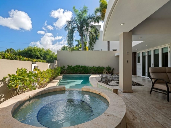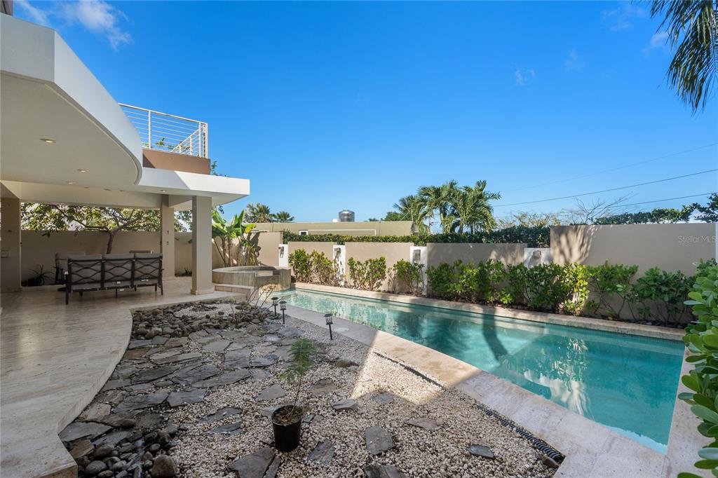 The outdoor living area is designed for relaxation and enjoyment, featuring a covered terrace with travertine flooring, a stunning pool with jacuzzi, and a full exterior bathroom, creating a true resort-style ambiance at home.