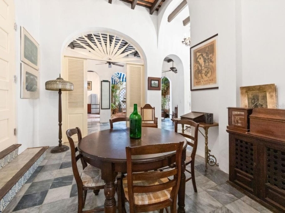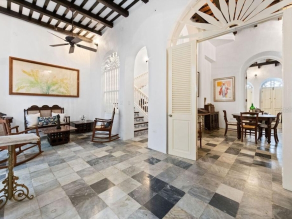 Step into a piece of history with this exquisitely renovated 2,716 SF Spanish Colonial masterpiece, nestled next to the Governor’s Mansion and steps to La Princesa Boardwalk in Old San Juan. Thoughtfully restored to preserve its timeless elegance, this two-story residence seamlessly blends historic charm with modern comforts. From the moment you enter, you are welcomed by an air-conditioned grand room with soaring 20-foot ceilings, where a full-wall library invites both quiet reflection and sophisticated entertaining. Every step through this home tells a story, with intricate tilework sourced from the historic San José Church (circa 1810), adding an unparalleled touch of authenticity and character. Original "soles truncos" archways stand as a testament to the home’s Spanish heritage, casting beautiful patterns of light throughout the space. Designed for both elegance and ease, the living room, dining area, and kitchen flow seamlessly through graceful arched openings to an indoor covered terrance and interior patio where natural light and fresh air create an inviting atmosphere for relaxation or entertaining. A conveniently located half bath is available for guests. The newly crafted wooden kitchen, equipped with brand-new appliances and a washer/dryer, is enhanced by traditional arches and stained-glass “vitrales,” adding both beauty and functionality to the space. Upstairs, you’ll find three spacious air conditioned bedrooms, three full bathrooms, and a laundry room. The two primary bedrooms feature custom closets, restored original wood floors, and double doors that open onto Old San Juan’s iconic balconies, offering picturesque views of the historic streetscape. An additional open balcony overlooks the indoor garden, providing the perfect spot to unwind. The property includes a full-power generator and a water cistern for added convenience and reliability. Ideally located on San Francisco Street, this exceptional home offers both security, with a police station directly across the street, and convenience, just a short walk from the San Juan Cathedral, Plaza de Armas, and an array of fine dining restaurants. A rare opportunity to own a true Old San Juan treasure, this residence is a perfect blend of history, charm, and refined living.