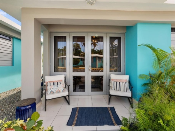 Nestled just steps from the shoreline, this charming beach bungalow offers the perfect blend of relaxation and coastal charm. Surrounded by swaying palm trees and kissed by ocean breezes, this coastal cabin features a simple yet elegant design and is completely turnkey. Inside, the open-plan layout includes a cozy living area, a compact but fully equipped kitchen, and very spacious bedroom. The hallway between the kitchen and bathroom houses the laundry closet. Outside a shaded porch provides the perfect spot to enjoy morning coffee or sunset cocktails while listening to the gentle waves. Within the gated community of Aguada Sea Beach Villas is the oceanside pool including its own covered mini pavilion with bathrooms which is perfect for beach BBQs. This casita comes with one designated parking spot and HOA fess are only $135/month. Perfect investment opportunity for those who love oceanfront living and passive income when they are not using it. Rental income history is available for qualified buyers.