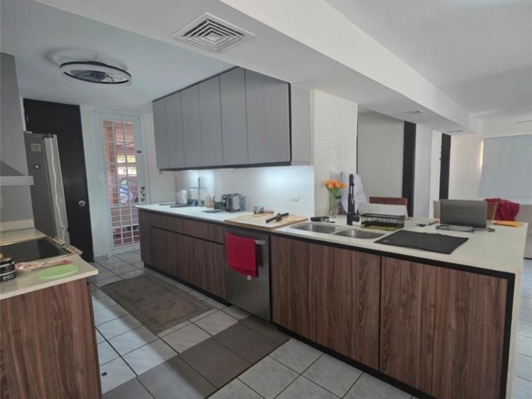 The fully renovated kitchen features quartz countertops, ample storage space, and includes a dishwasher, modern refrigerator, and electric range. The open-concept design seamlessly connects the living, dining, and kitchen areas, creating a bright and inviting atmosphere.