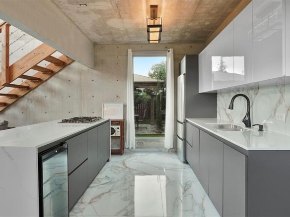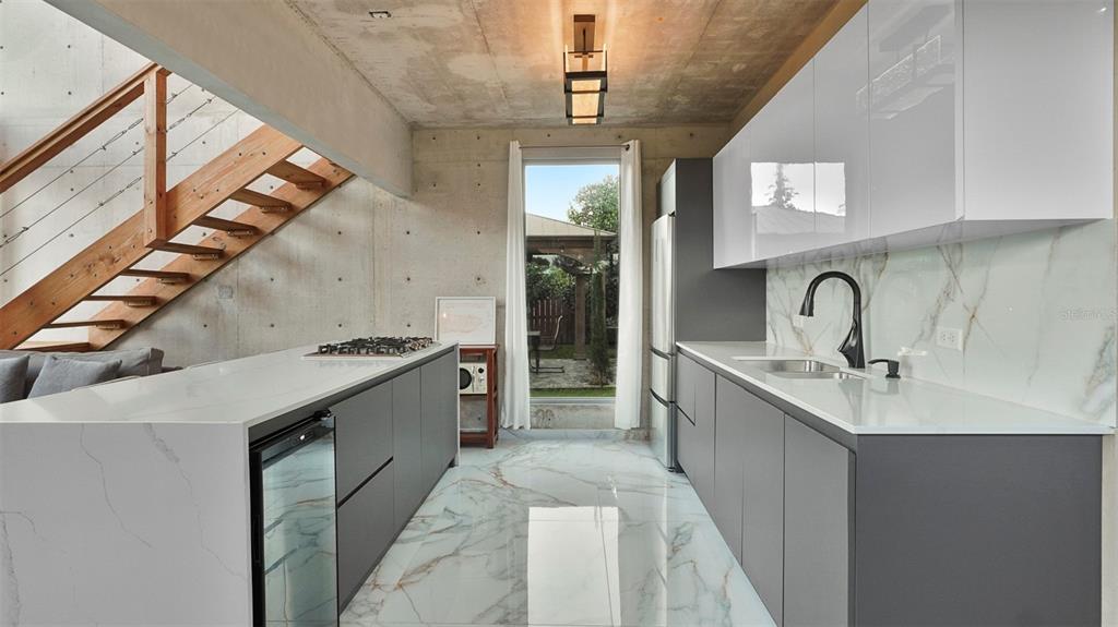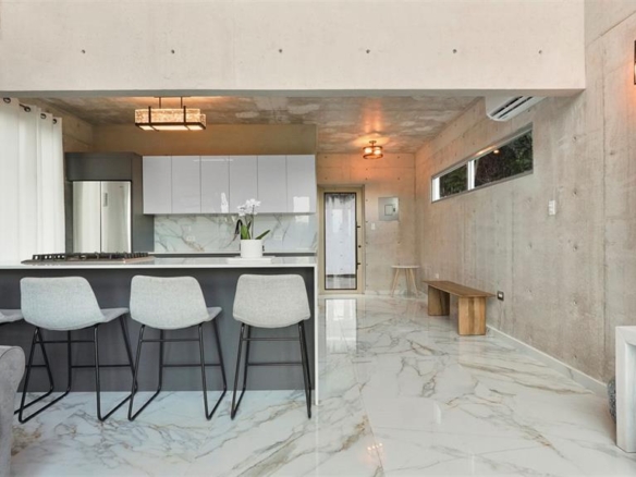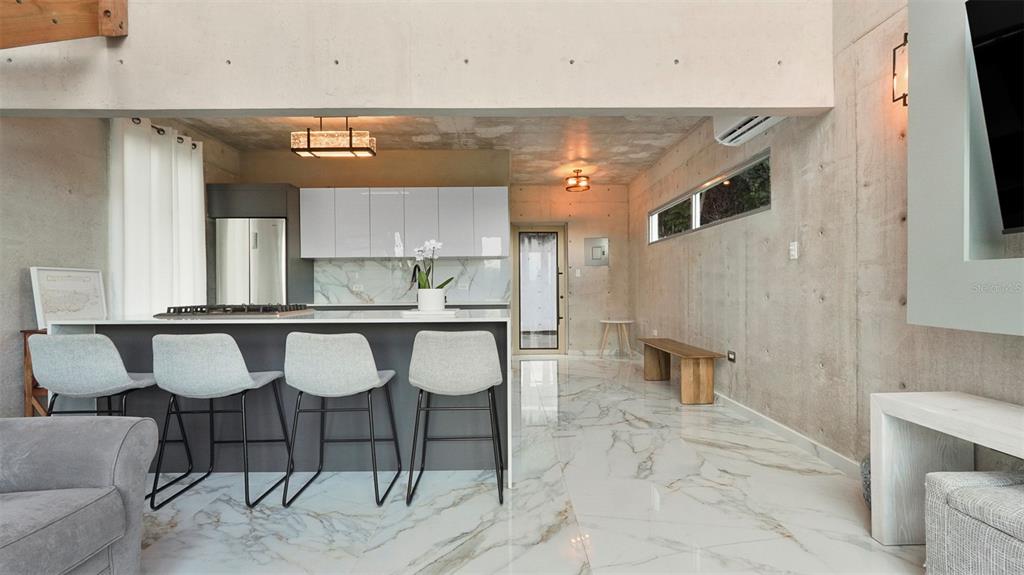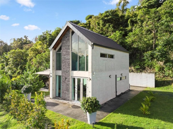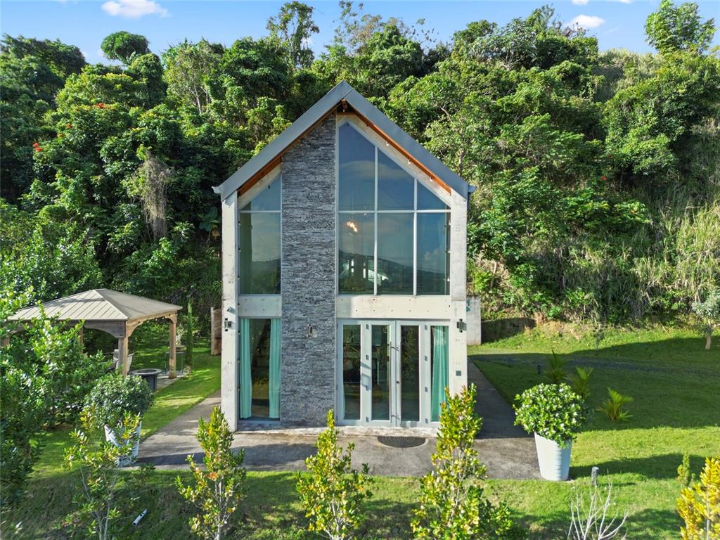 Set in the mountains of Cayey, this two-level designer cabin blends Scandinavian-inspired warmth with modern architectural elements. Soaring ceilings with exposed wooden beams, floor-to-ceiling windows, and exposed cement finishes create a clean, elevated aesthetic filled with natural light. The first level features an open kitchen and living area with a full bathroom, while a sculptural wooden staircase connects the levels, leading to a serene bedroom above.